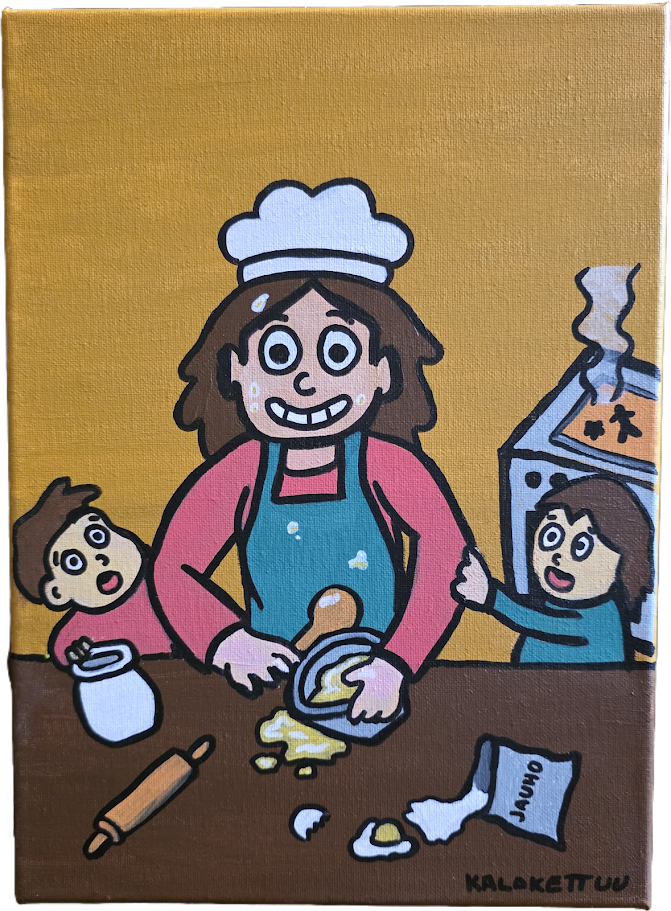 🖌️ Kuvan on maalannut Melina Häkkilä / Kalakettuu akryyliväreillä, ja se hehkuu tuttua tunnelmaa: keittiö on jauhoissa, lapset auttavat omalla tavallaan ja piparit ovat joko täydellisiä tai hiukan palaneita – mutta juuri siinä on joulun sydän.