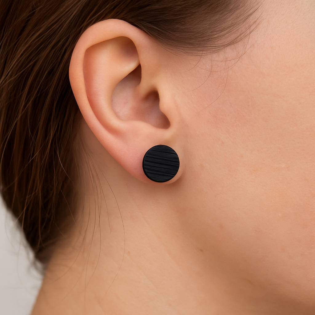 Hohtolinja-korvakorut ovat minimalistisen tyylikkäät nappikorvakorut, joissa raidallinen pinta hohtaa eri valoissa kauniisti.