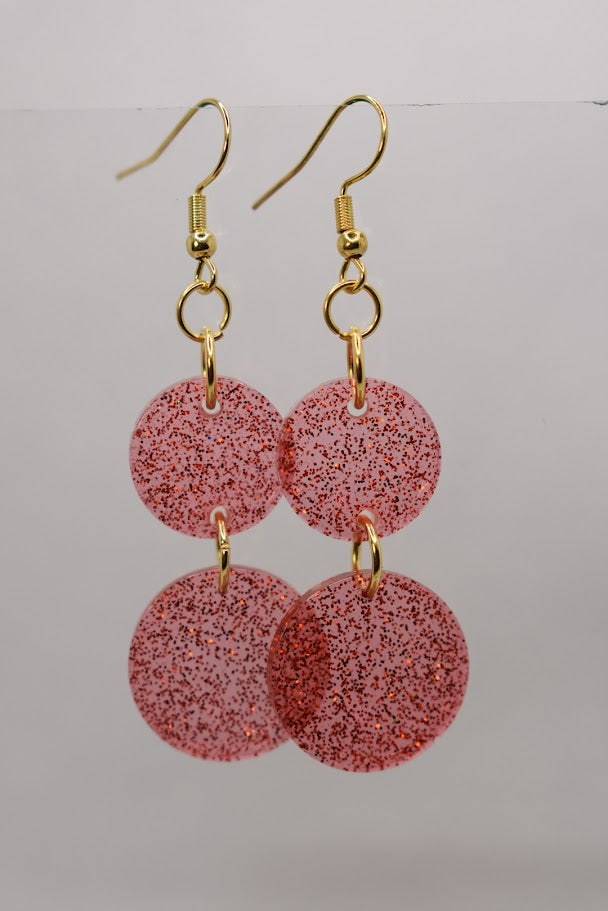 Käsintehdyt näyttävät korvakorut, joissa molemmat osat ovat UV-hartsia täynnä hienoa punaista glitteriä.