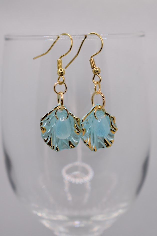 Merikaste-korvakorut yhdistävät kullanhohtoisen simpukkaelementin ja hennon lasihelmen, luoden koruparin, joka huokuu merituulen keveyttä ja kesän lämpöä.