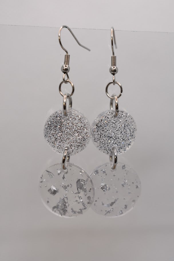 Näyttävät ja kevyet korvakorut, joissa kaikki osat on valettu UV-hartsista – ylempi osa täynnä hienoa glitterhohdetta ja alempi osa koristeltu hopeanvärisillä muruilla.